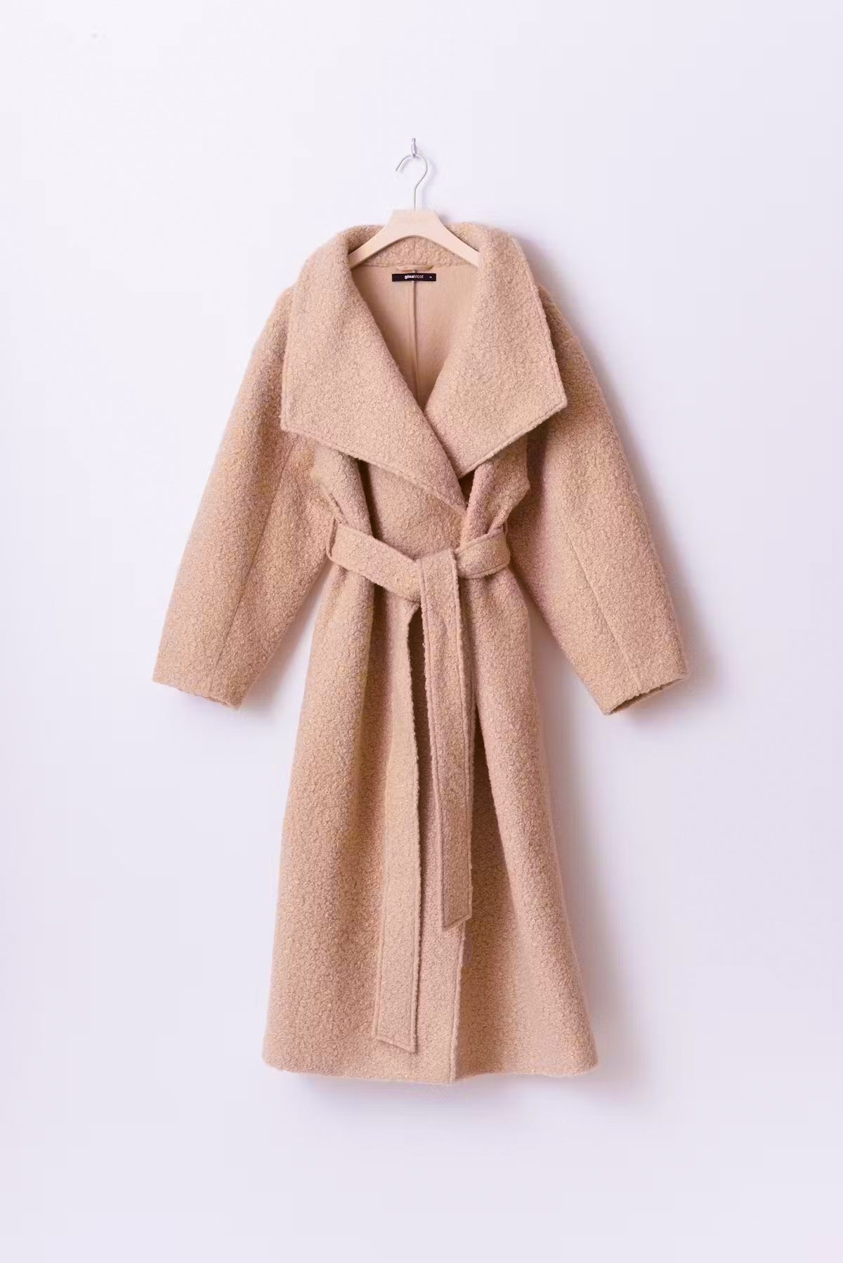 - Langer Mantel aus Bouclé-Stoff mit Gürtel zum selberbinden in der Taille.