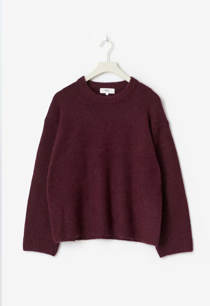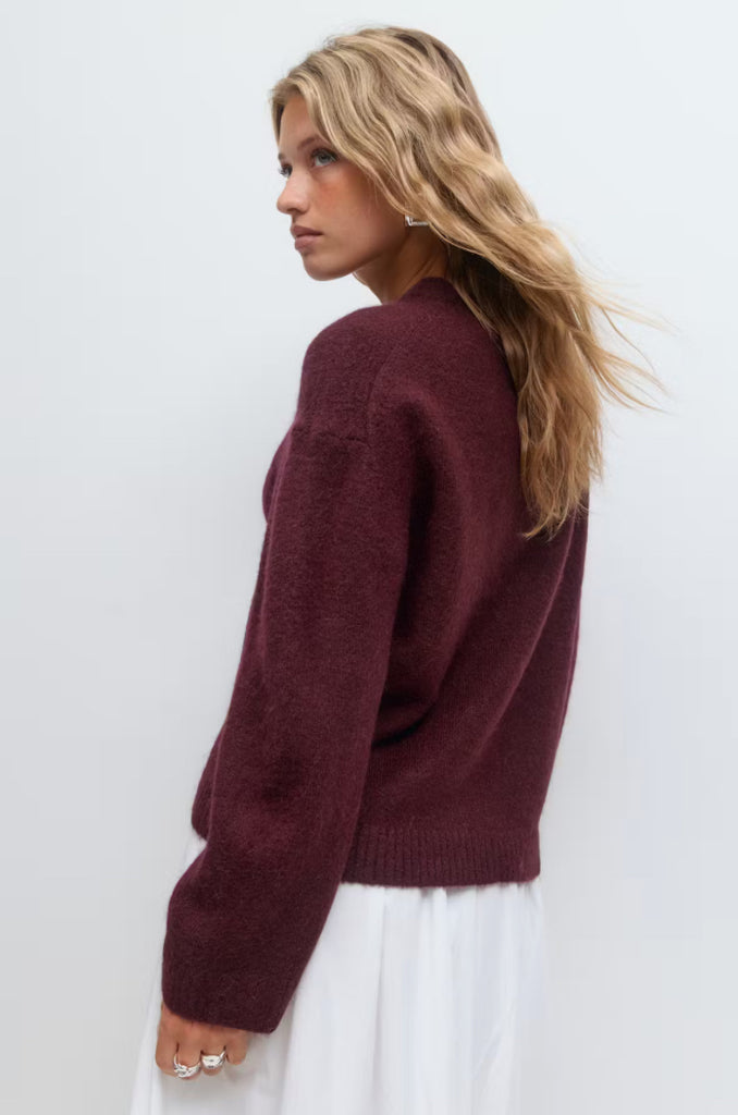 - Er hat Ballonärmel, normale Länge und Rippenstrick an den Ärmelenden und an der Unterkante.