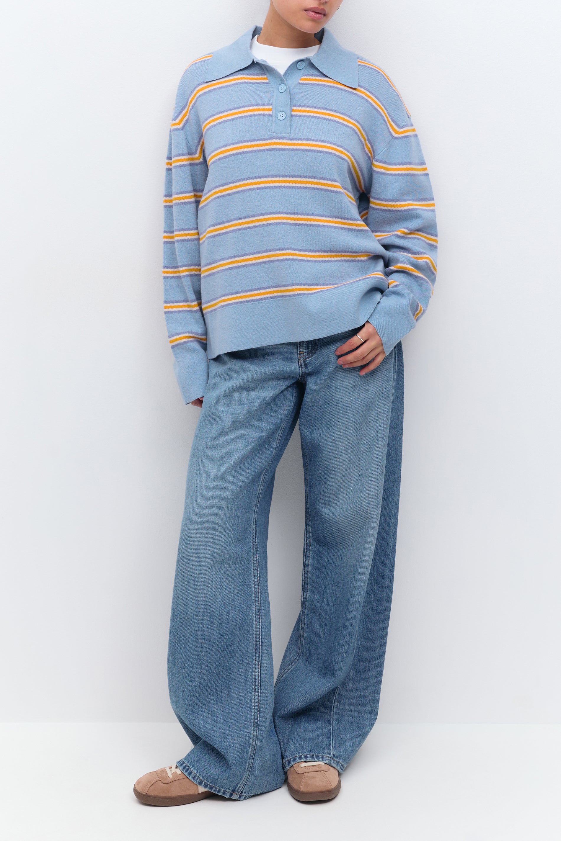 Das Pikeeshirt ist weiβ und hat Oversize-Passform. Es hat Knöpfe auf der Oberseite, gestrickte Qualität, langen Ärmel und Rippenstrick an den Ärmelenden und an der Unterkante