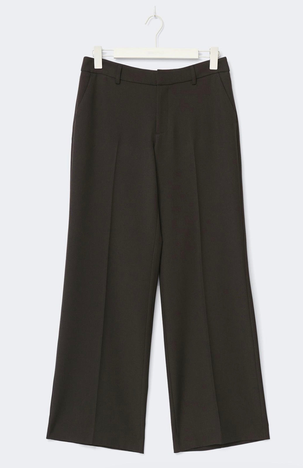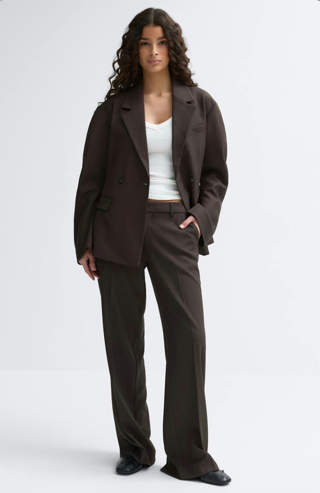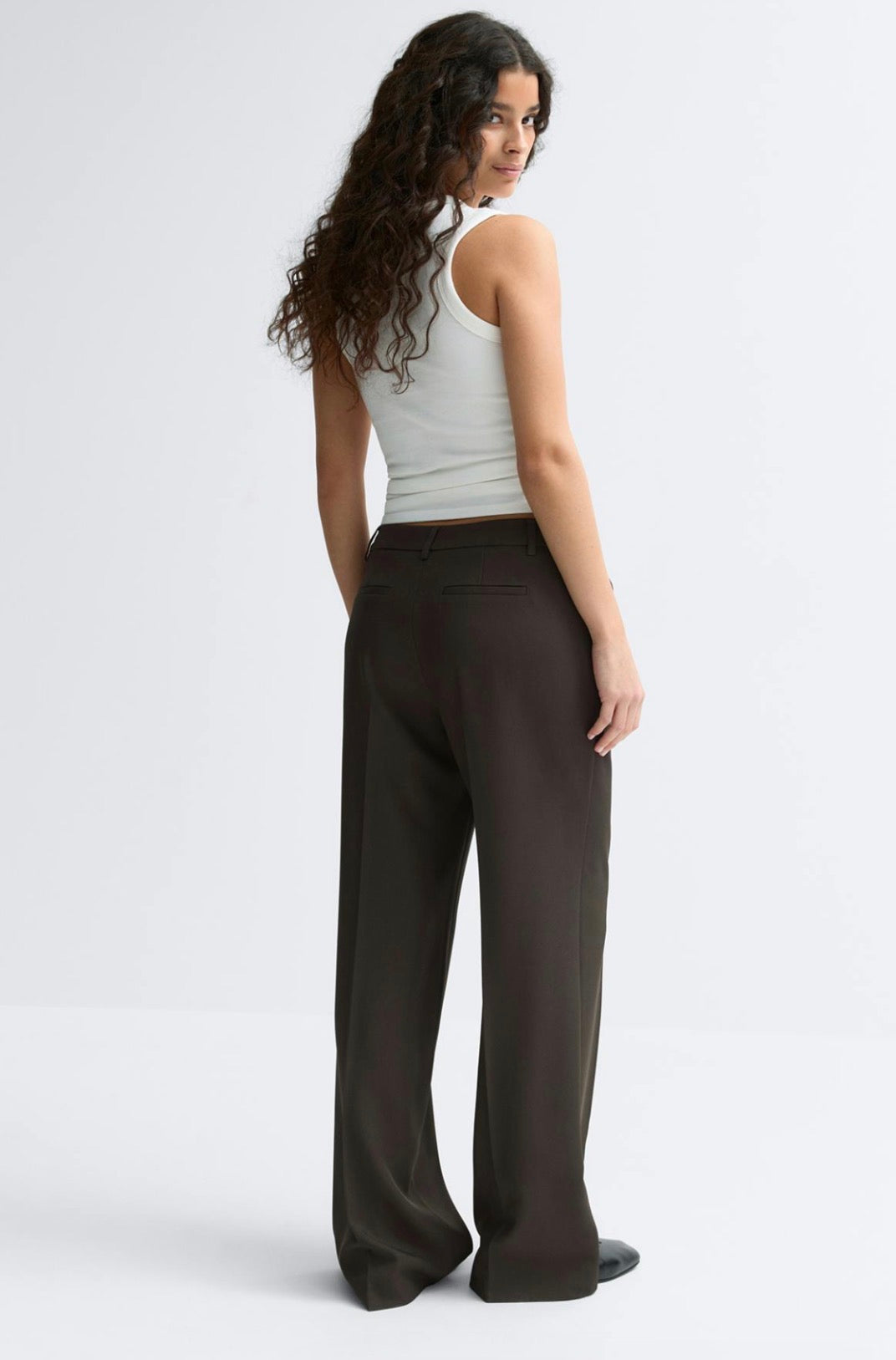 Die Hosen sind braun und haben normale Länge. Sie haben mittlere Taille, normale Größe, Taschen, Reißverschluss und Gürtelschlaufen.