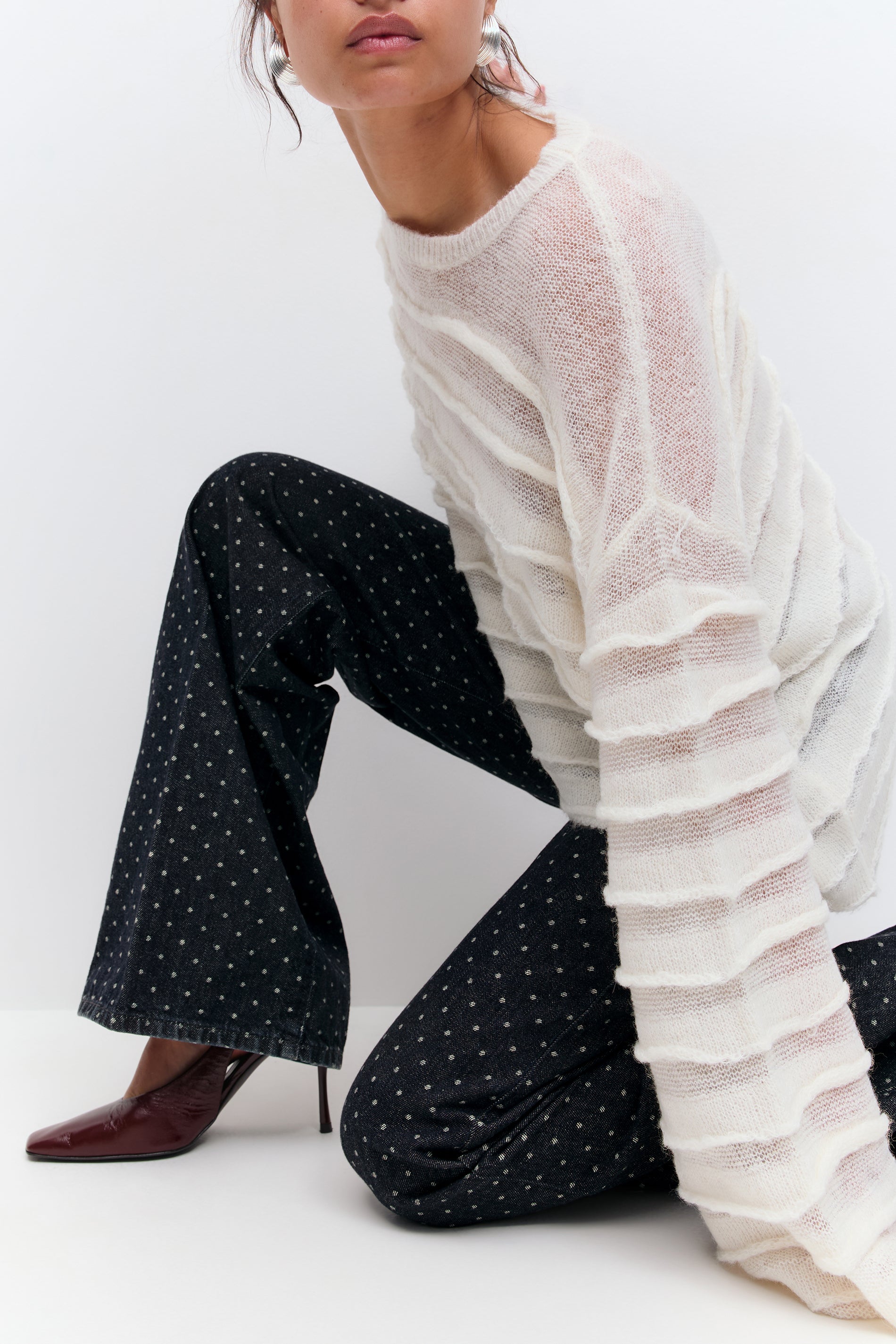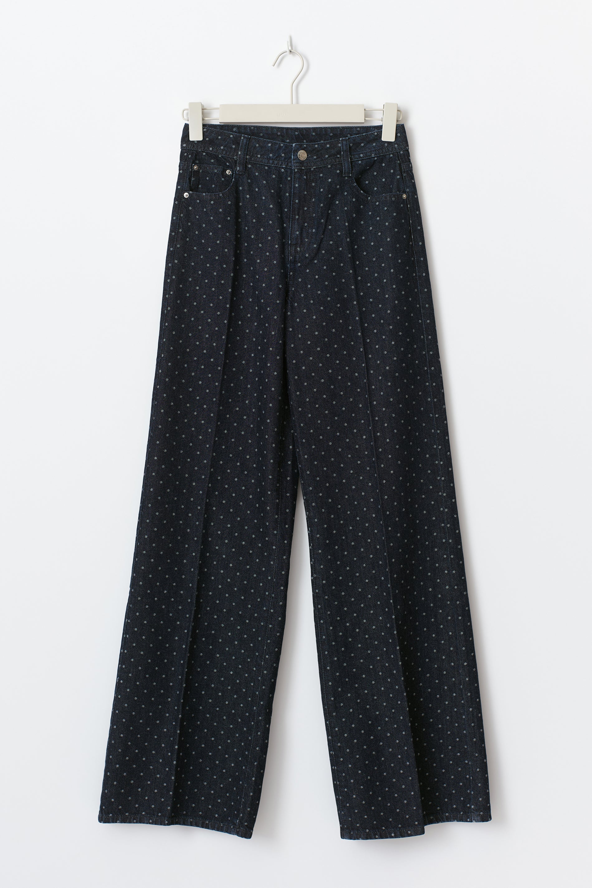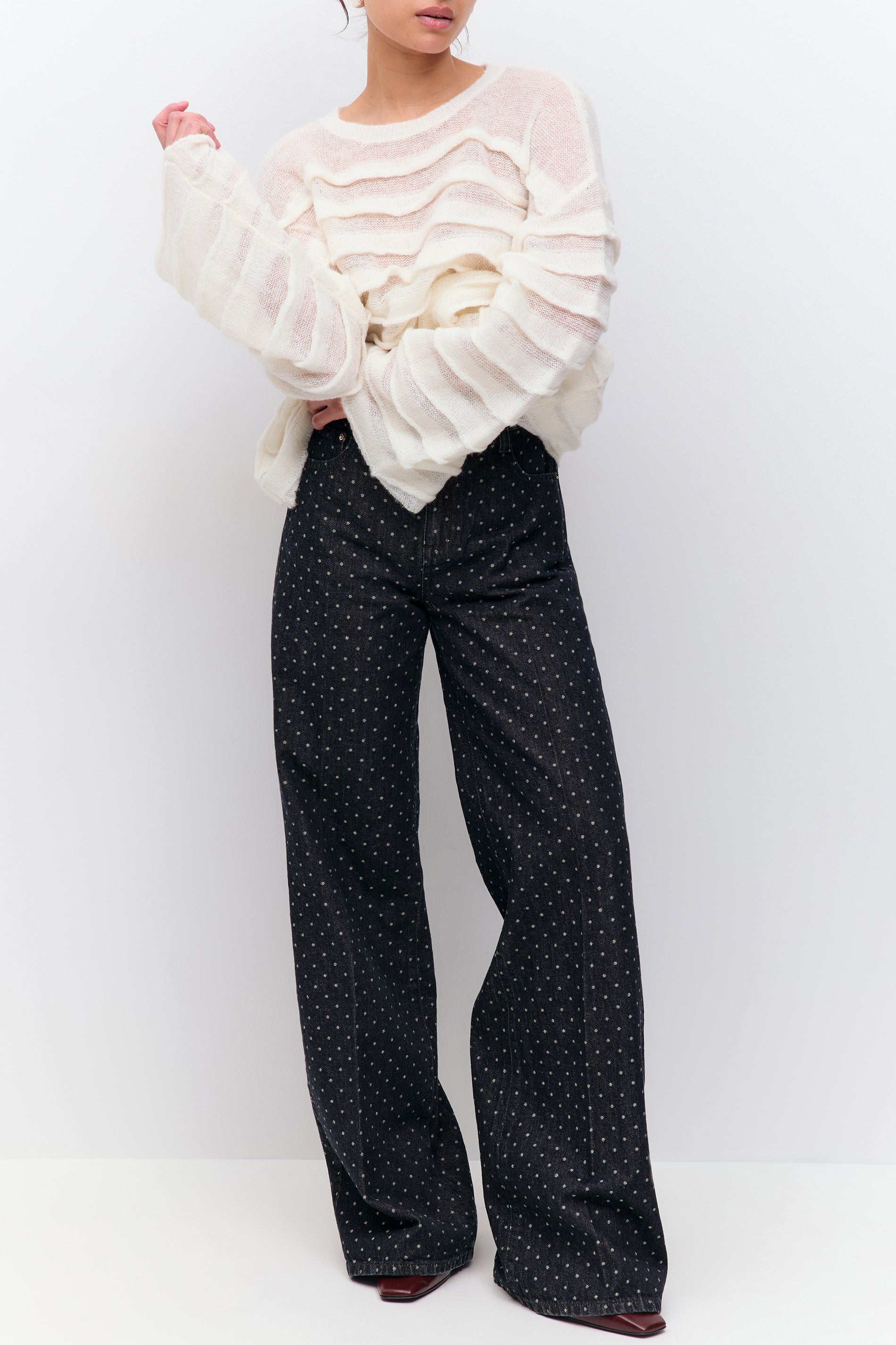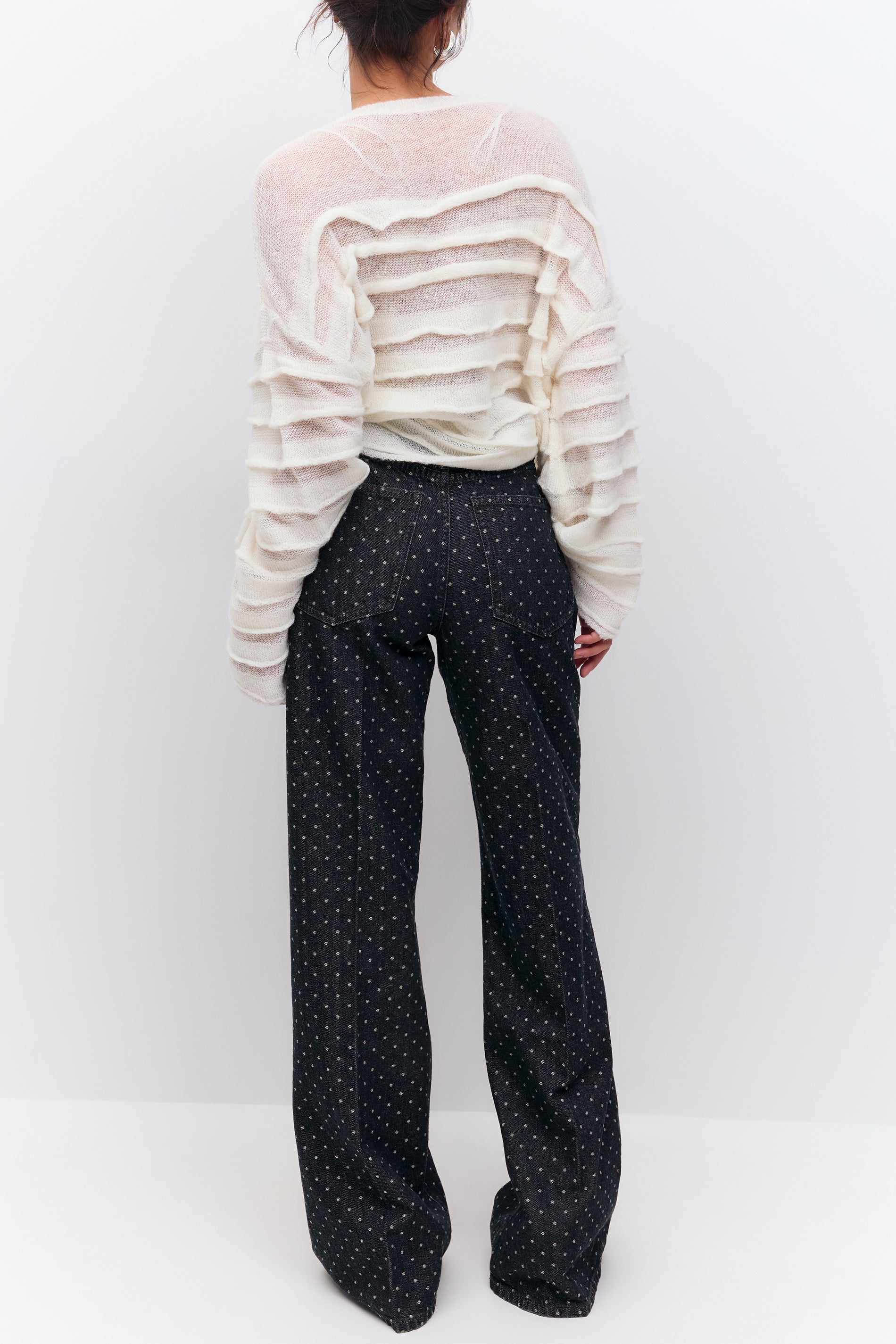 Sie hat breite Beine, Taschen vorne und hinten, Gürtelschlaufen und Reißverschluss.