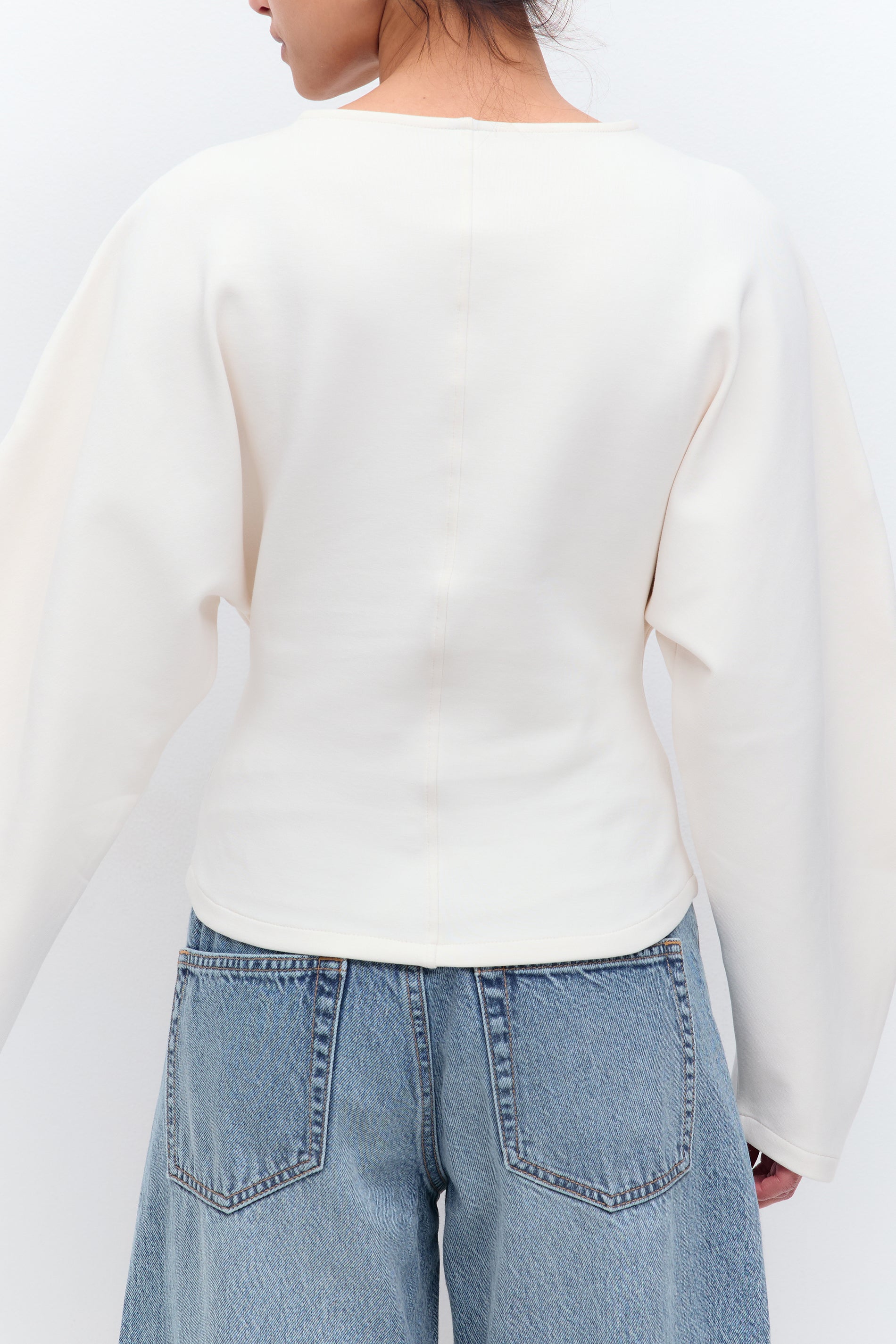 - Das Sweatshirt ist weiß und hat eine enge Taille.