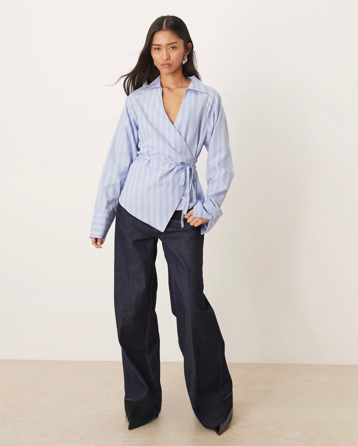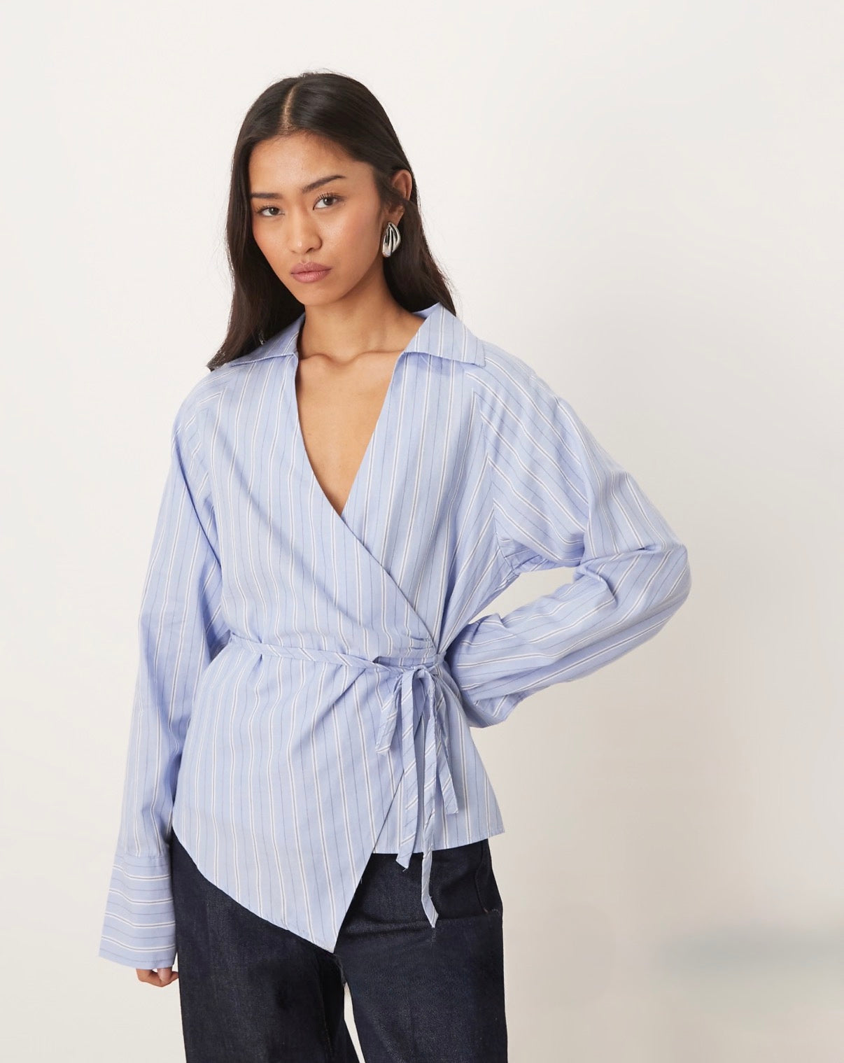 - Das Hemd ist blau, weiß gestreift mit V-Ausschnitt.